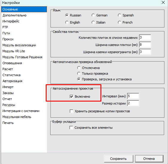 Убедитесь, что у вас установлена галочка "Включить" в пункте "Автосохранение проектов"