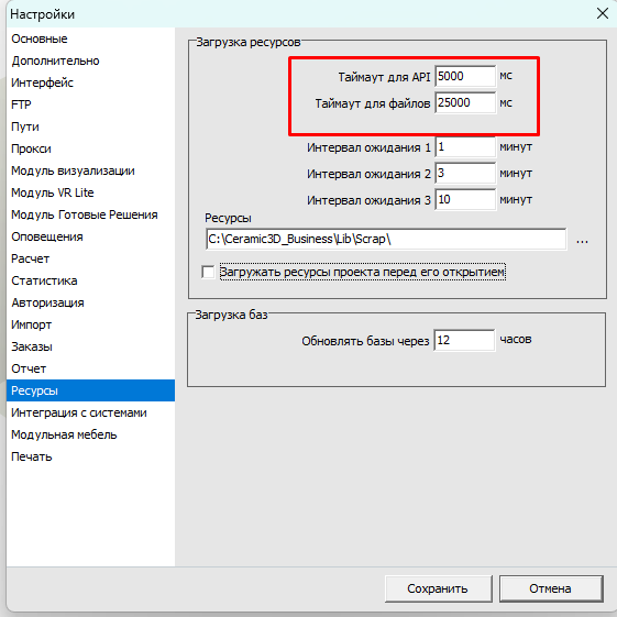 3. В Правка-Настройки - Ресурсы установите Таймаут - 100000