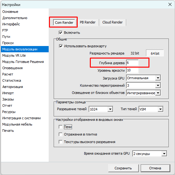 Перейдите в Правка - Настройки - Модуль визуализации на вкладку СОМ render и установите параметр "Глубина дерева" на единицу меньше (например: если было 7, установите 6)