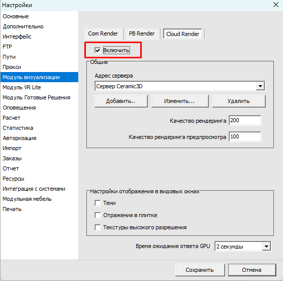 Данные настройки доступны при включенном СОМ render, инструкция по включению СОМ render (если данный модуль доступен на вашем ключе)