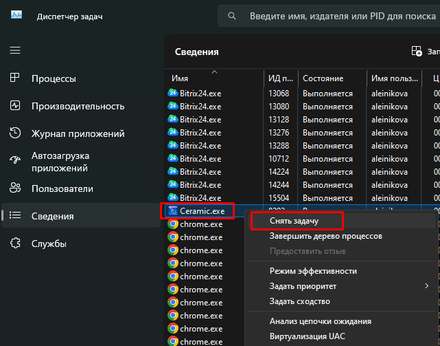 3.Найдите процесс "Ceramic.exe" и нажмите по каждому открытому процессу Ceramic.exe правой кнопкой мыши - Снять задачу