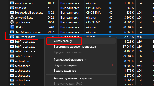 - Нажмите правой кнопкой мыши по процессу SubProcess (Если при обновлении программы, в окне с ошибкой будет указан другой процесс, то нужно выбрать его в диспетчере задач) - Снять задачу.