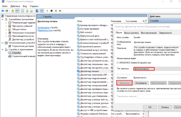 Перейдите в Службы и приложения (Правой кнопкой мыши по Мой компьютер – Управление – Службы и приложения или введите в строке поиска Выполнить и введите команду compmgmt.msc), найдите пункт Диспетчер печати и установите значение Автоматически – Запустить)