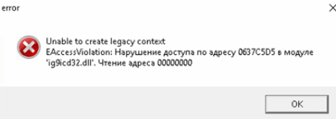 Нарушение доступа по адресу 0637С5В5 в модуле ig9icd32.dd. Unable to create legacy context
